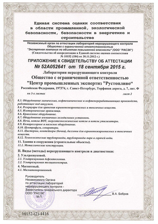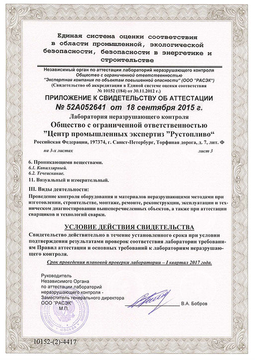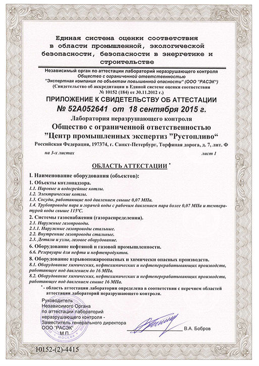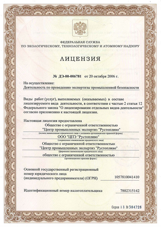Центр промышленных экспертиз "Рустопливо" имеет все необходимые лицензии и аккредитации для осуществления заявленных видов деятельности: