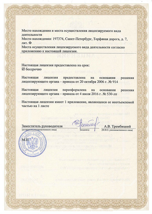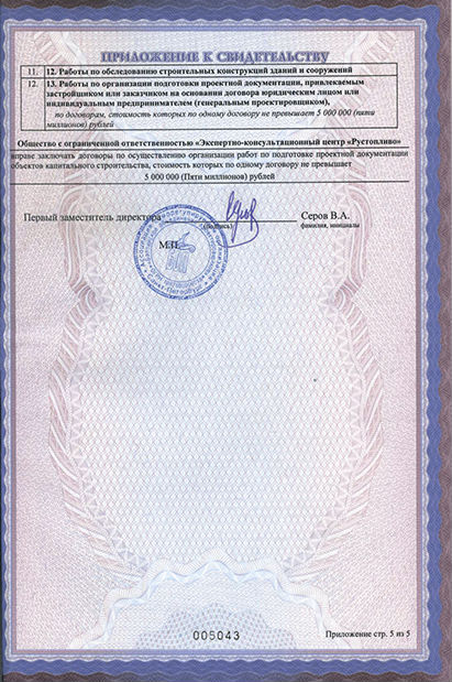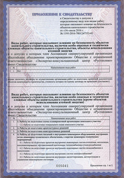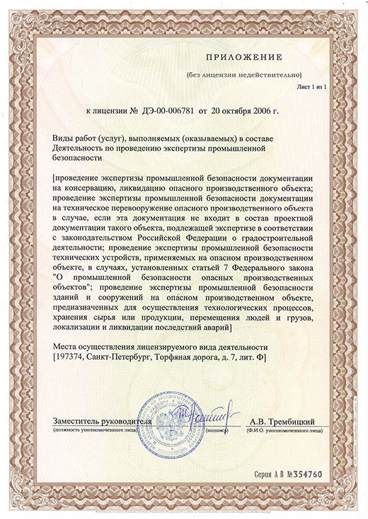Лицензия Федеральной службы по экологическому, технологическому и атомному надзору от 15.09.2011 № ДЭ-00-006781 на осуществление деятельности по проведению экспертизы промышленной безопасности (переоформлена на основании решения лицензирующего органа – приказа от 4 июля 2016 г. №530-лп).
