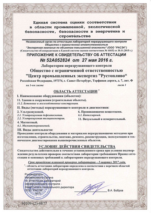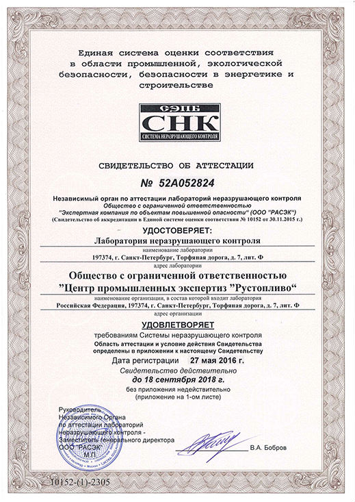 Свидетельство об аттестации лаборатории неразрушающего контроля № 52А052824 от 27.05.2016 г.