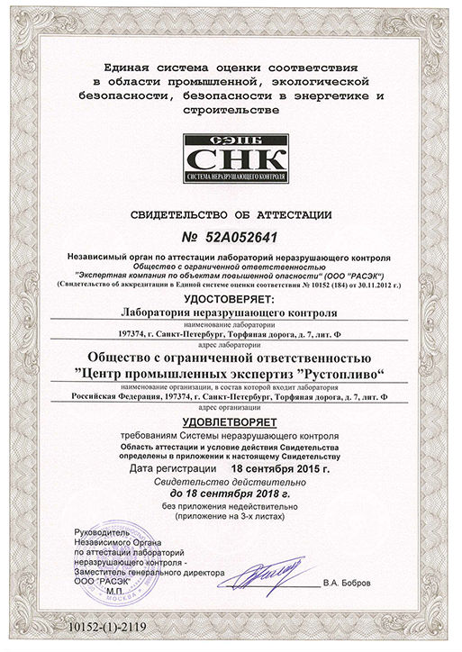 Свидетельство об аттестации лаборатории неразрушающего контроля № 52А052641 от 18.09.2015 г.