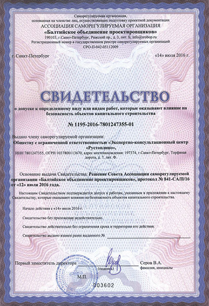 Свидетельство о членстве в СРО АССОЦИАЦИЯ САМОРЕГУЛИРУЕМАЯ ОРГАНИЗАЦИЯ "Балтийское объединение проектировщиков" №1195-2016-7801247355-01 от 14.06.2016 г.